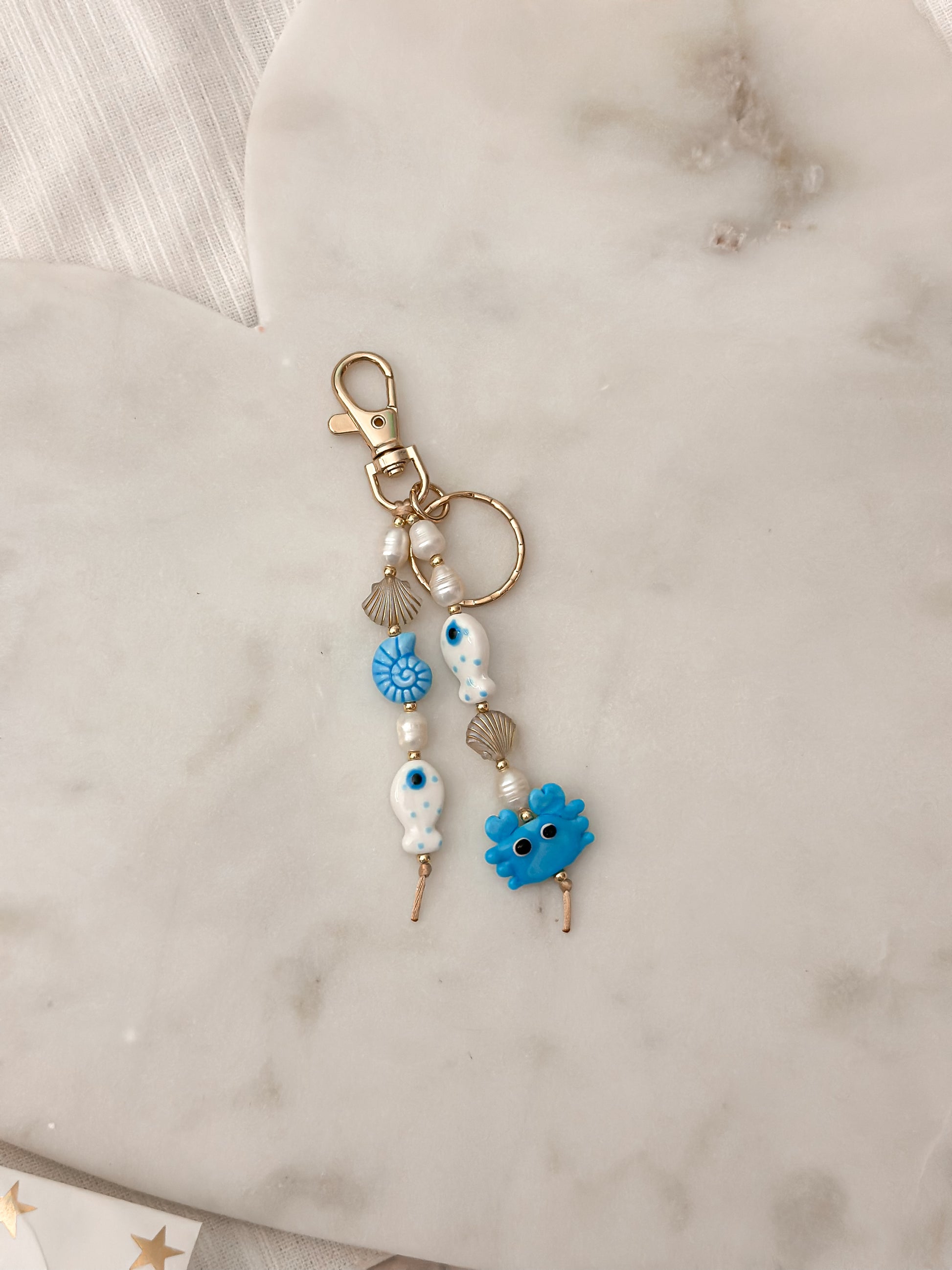 Este keychain/bag charm está diseñado para añadir un toque único y elegante a tus llaves, cartera o bulto. Cada pieza se trabaja cuidadosamente a mano, combinando materiales de calidad y detalles que resaltan tu estilo personal.