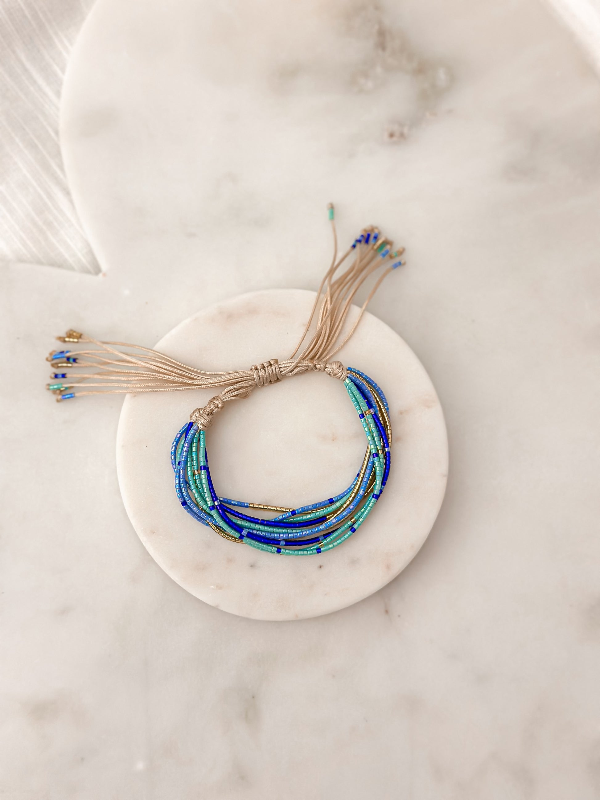 Pulsera ajustable hecha a mano, diseñada con múltiples hilos que crean el efecto de llevar varias pulseras en una sola pieza. Elaborada con finas cuentas Miyuki y cordón de nylon resistente, esta pulsera ofrece un estilo moderno, colorido y delicado. Su diseño liviano y cómodo la hace ideal para el uso diario, perfecta para complementar cualquier look y añadir un toque único y artesanal.